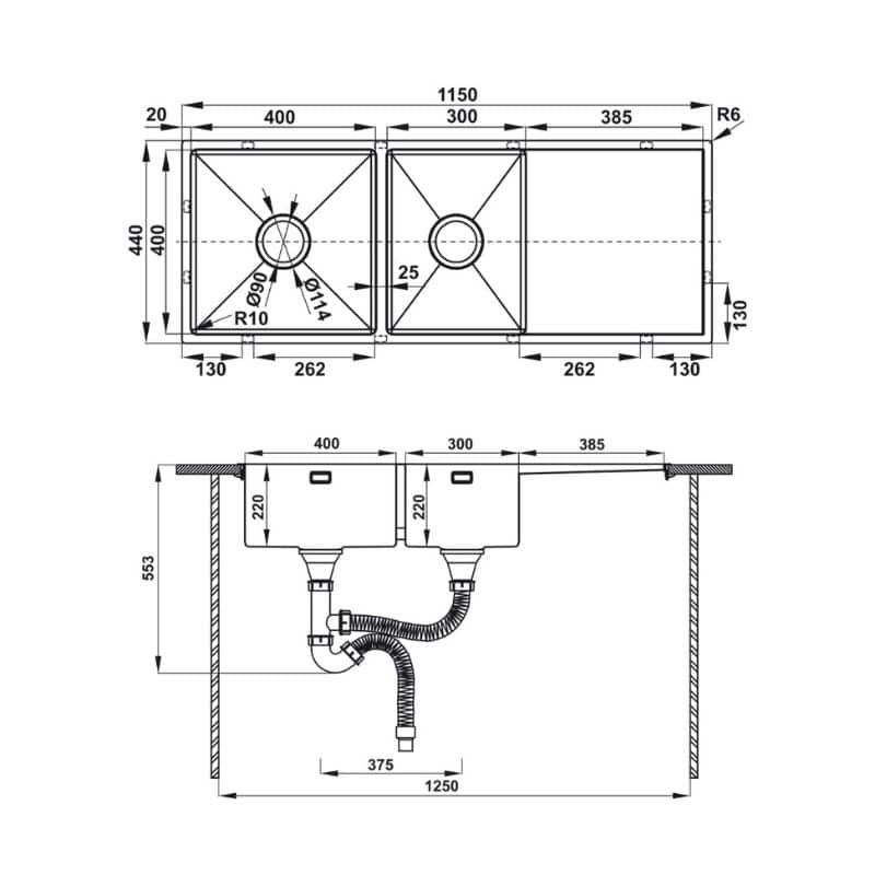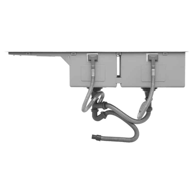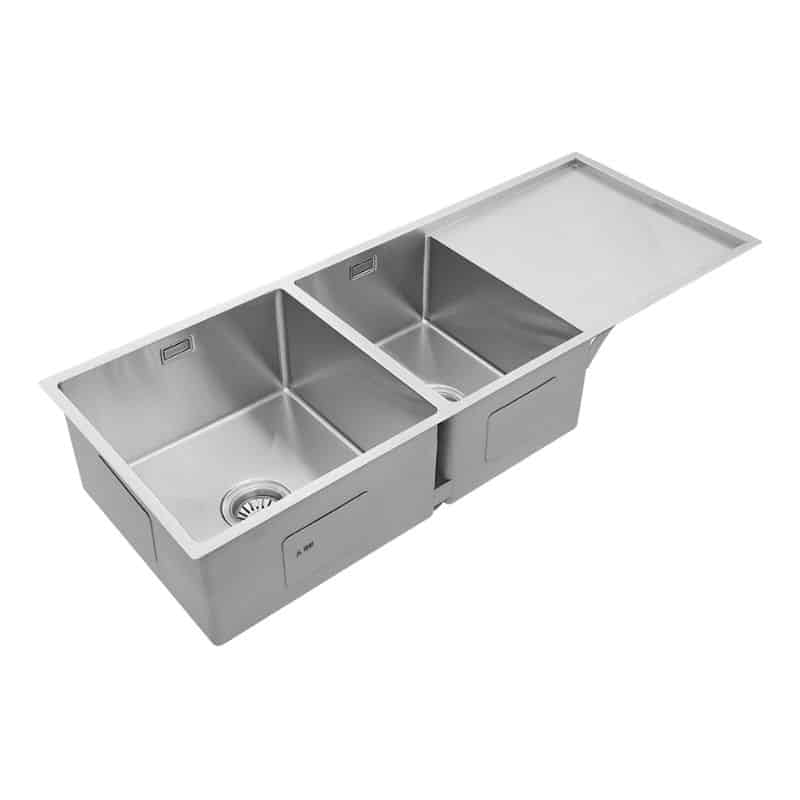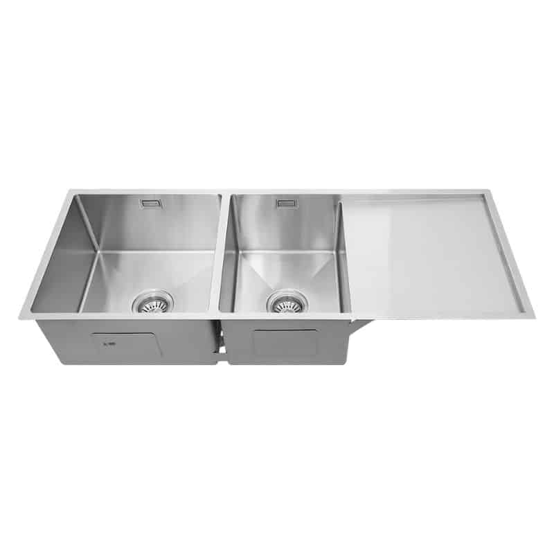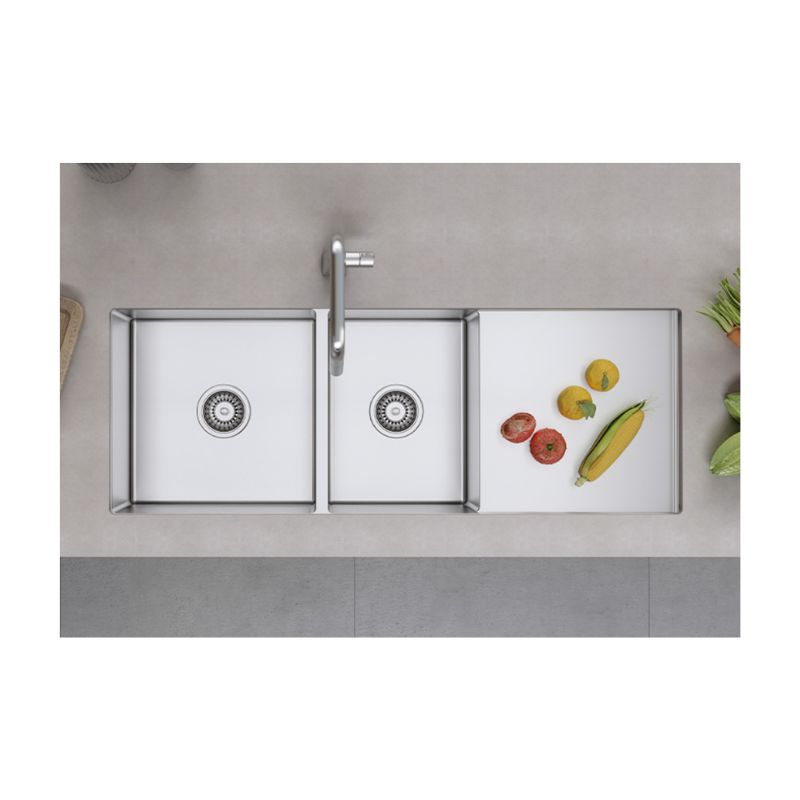 - Thiết kế 2 hộc rửa chính – phụ kèm bàn chờ ráo nước nằm phía tay phải, phù hợp với thói quen nấu nướng và sơ chế thực phẩm, tạo không gian thoải mái nhất khi sử dụng. Đặc biệt cấu tạo viền chậu có gờ cao hạn chế văng nước ra ngoài hiệu quả.