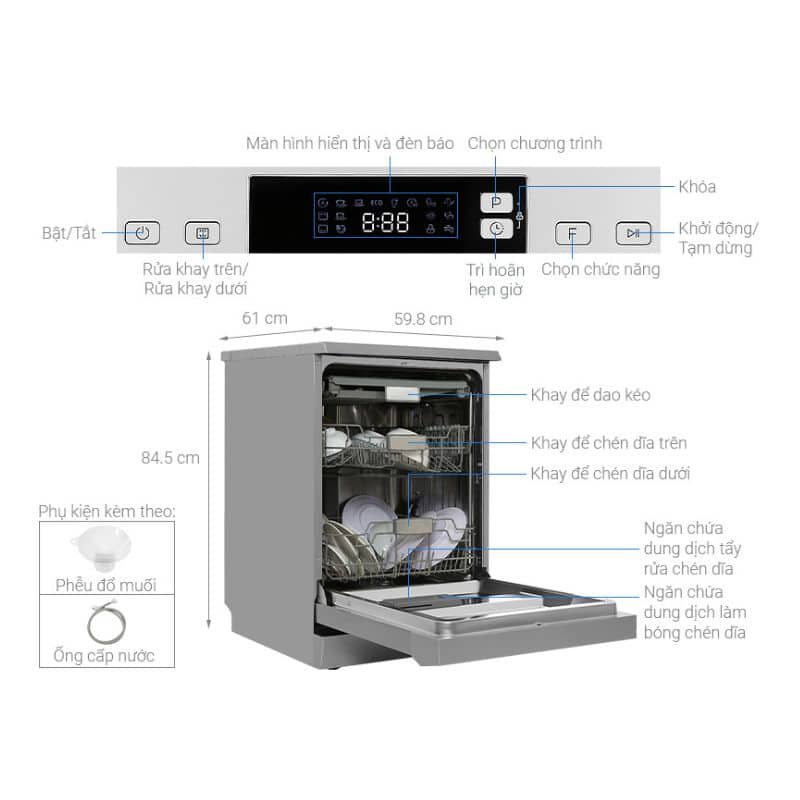 - Chức năng báo mức muối và chất tẩy rửa giúp người dùng dễ dàng theo dõi và bổ sung để ổn định hoạt động và hiệu quả sử dụng máy rửa chén.